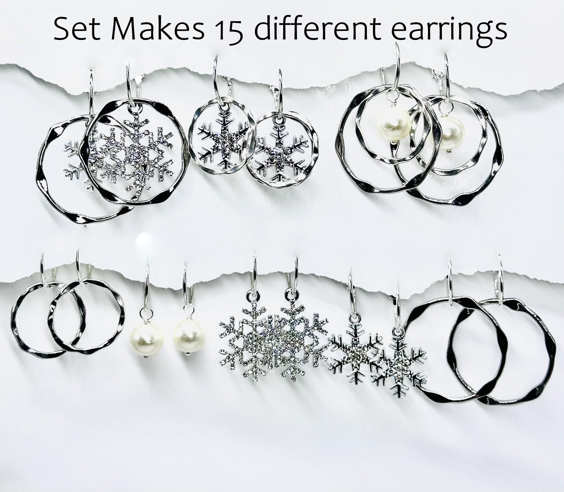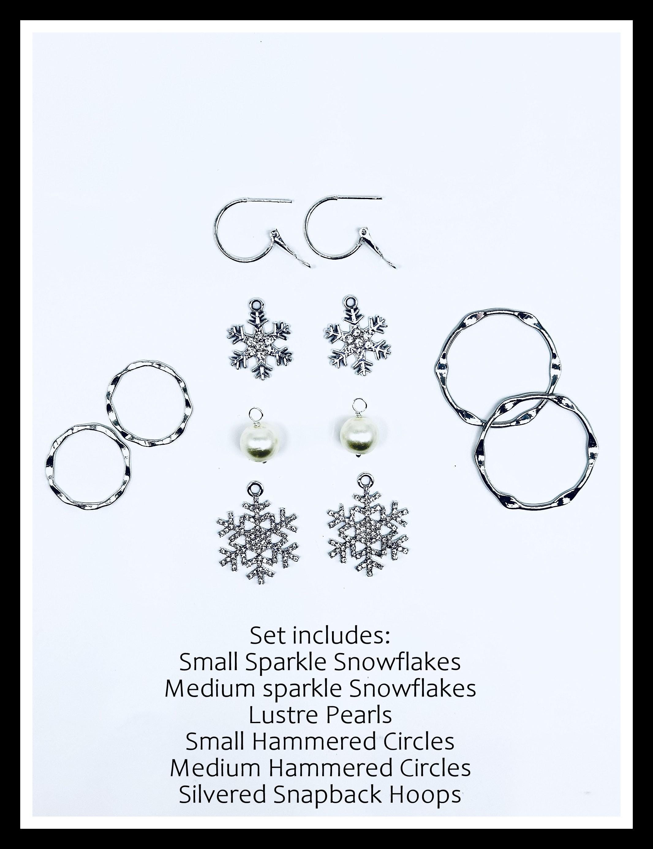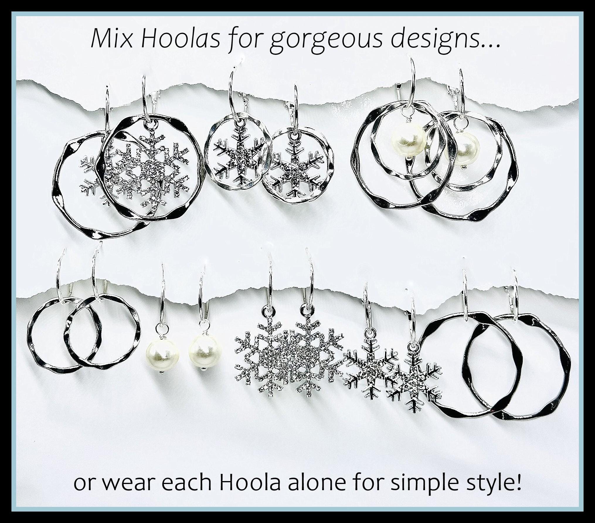 Christmas Holiday silver Earrings, holiday bling Earrings, Glitz earrings, Pearl Earrings, Snowflake Set. Sparkle snowflake charms, Pearl charms, mirrored, hammered circles and more. Each charm/Hoola fits on easy slide-on hoops to make many different earring designs. SEE ALSO SNOWFLAKE NECKLACE SET.
