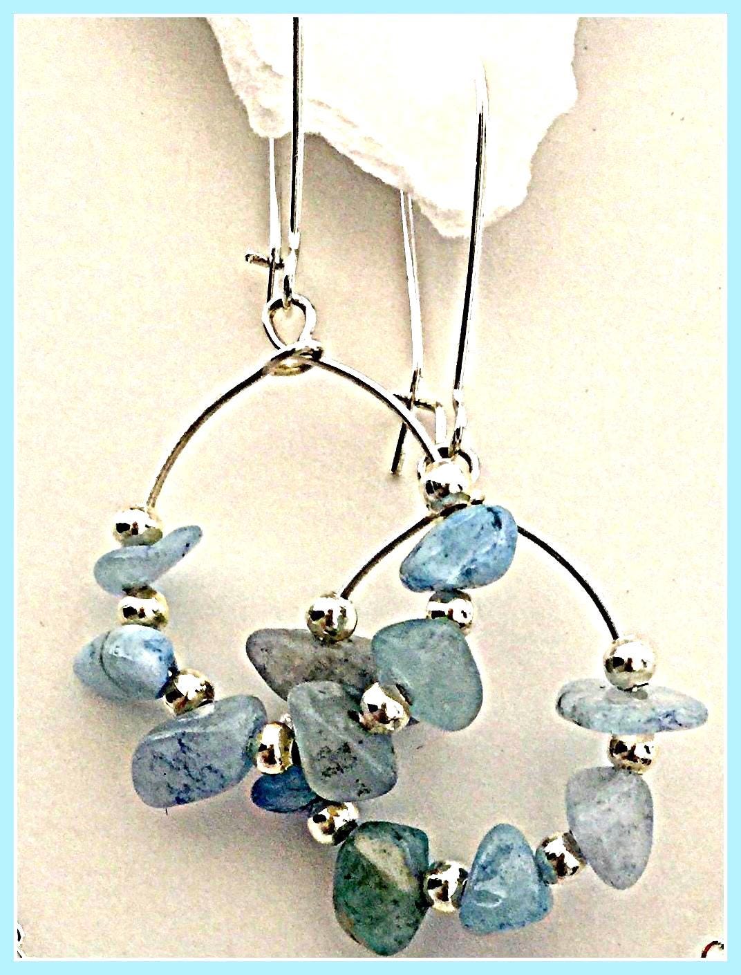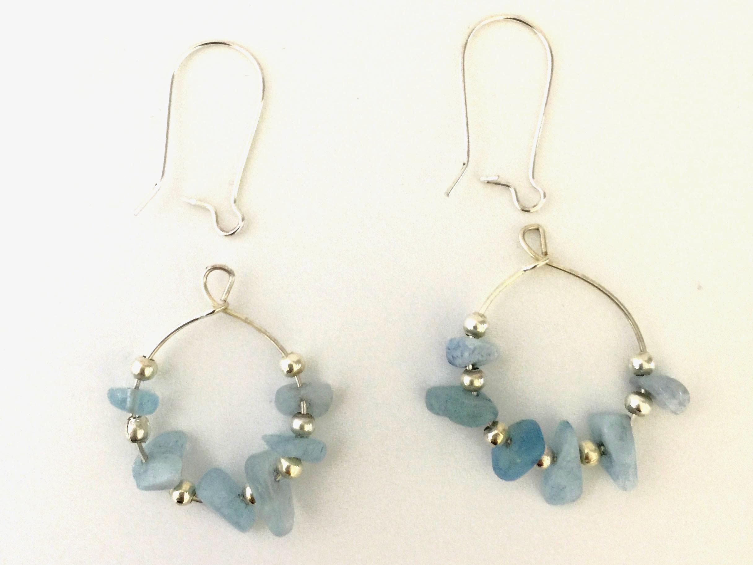 Aquamarine earrings slide on earwire for design opportunities. March birthstone. On special for only $9.99. No two pairs are alike as we make these with the raw nugget Aquamarine gemstones. These can be added to other Hoola charms or multiple designs. Set includes: Aquamarine raw nuggets on circle frame with separate silver plated earwires.
