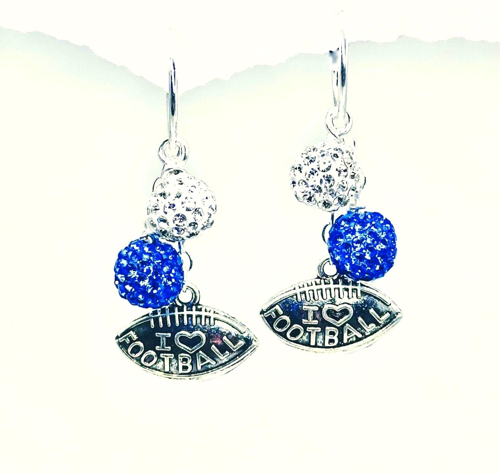 Go Lions Football Earrings, interchangeable so we call them "Game Day - Every Day Earrings" since you can still wear them after the game! Made with Honolulu Blue and sparkly white Hoola-charms. All Hoolas slide on interchangeable hoops for several design options. All made in Chelsea, Michigan.