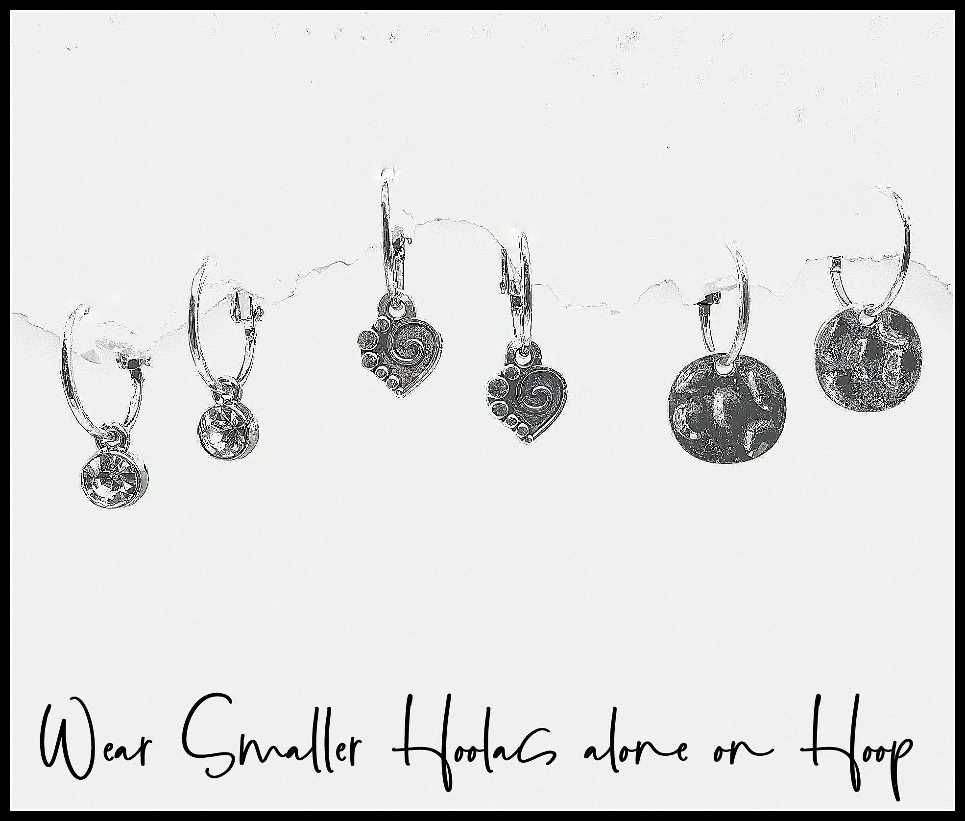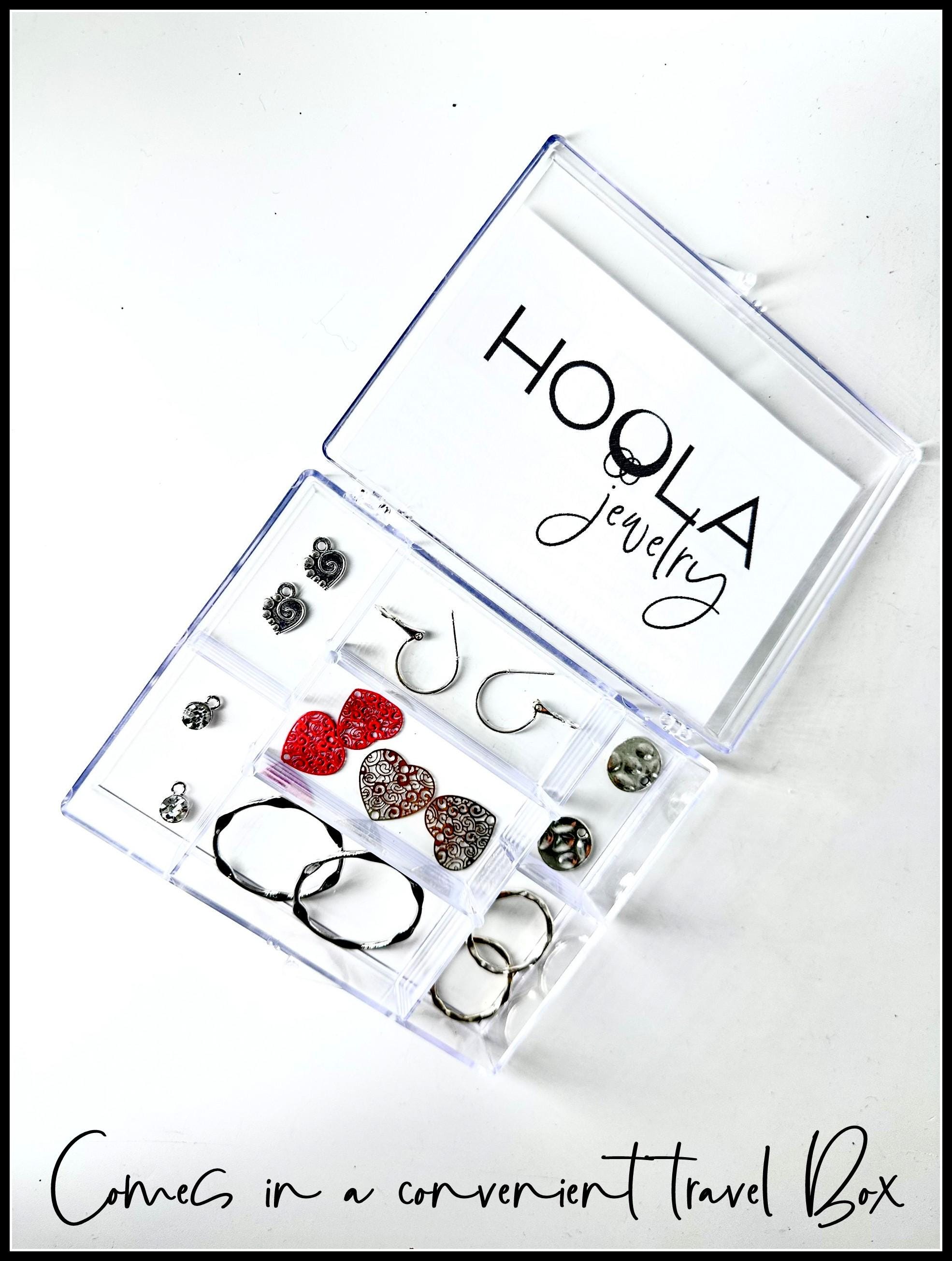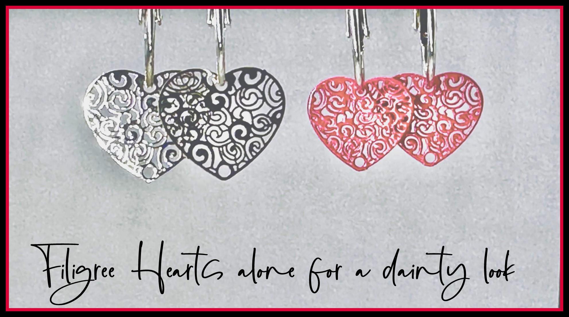 This set makes ver 50 pair of earring Designs. Just slie various HOOLA-charms on hoops and you have designed your own jewelry. Set includes silver hearts, plus 1 pair of red Filigree hearts, plus hammered circles and hammered round disc for many earring design options. So Fun! and So easy!