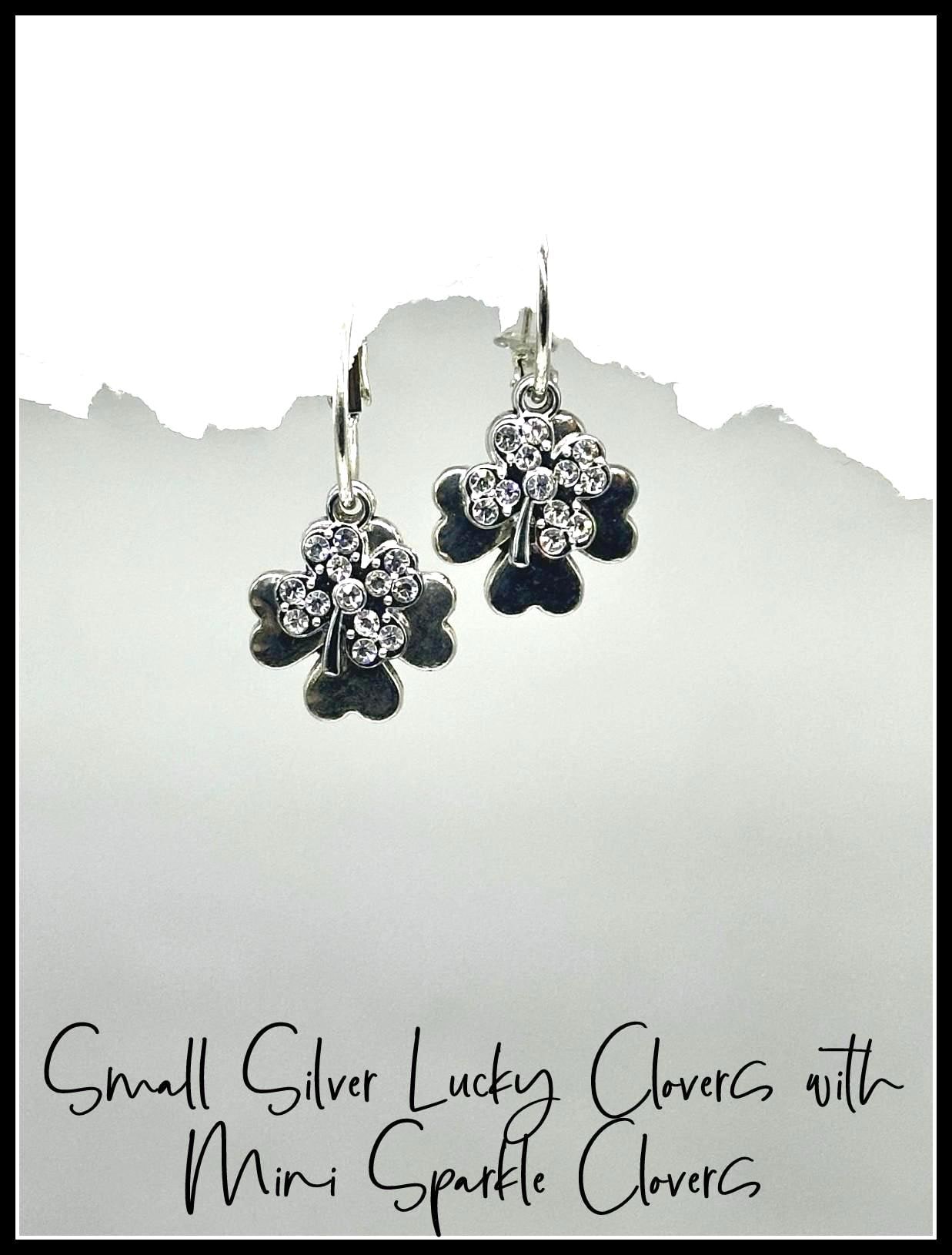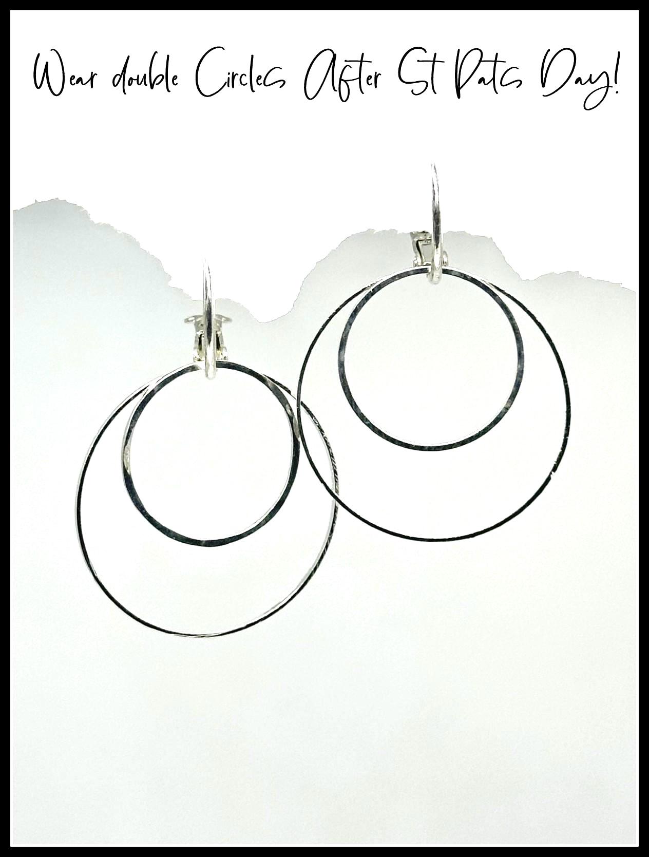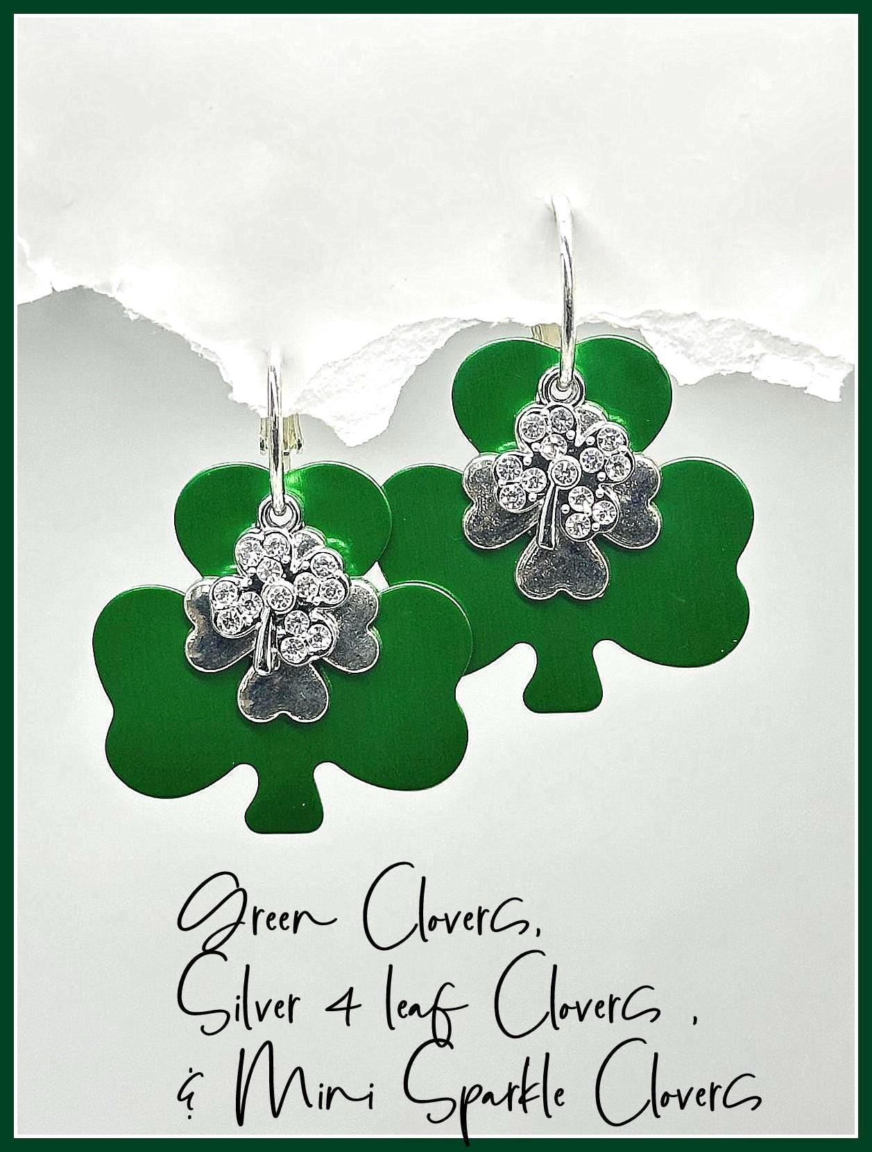 Interchangeable St Patrick's Day earrings, Green and Silver Hoola-charms slide on snapback hoops for various design options. Set includes 5 pairs of Hoolas plus easy-peasy snapback hoops.