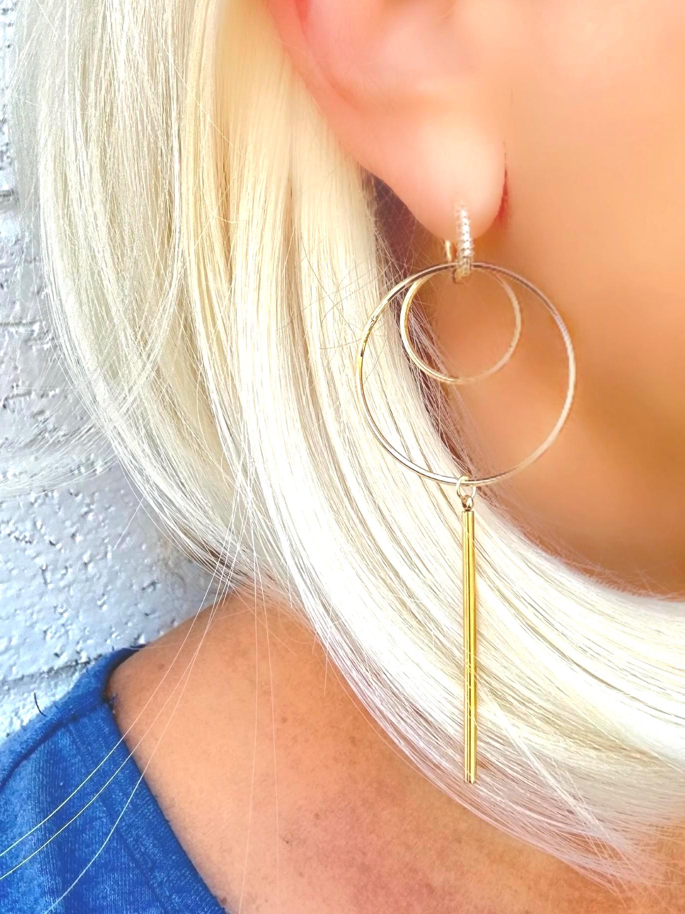 Interchangeable long gold earring set, Slide pieces on hoop to design your own earrings. choose hoop stylele from 18K gold overlay reversible huggie hoops or our easy-to-wear 18K gold overlay snapback hoops. Set includes: