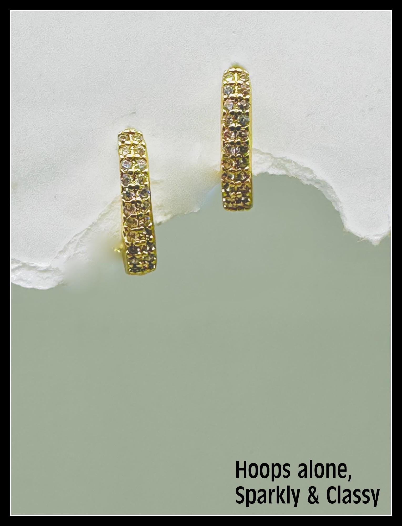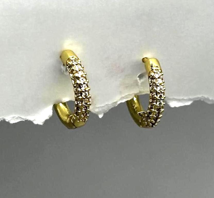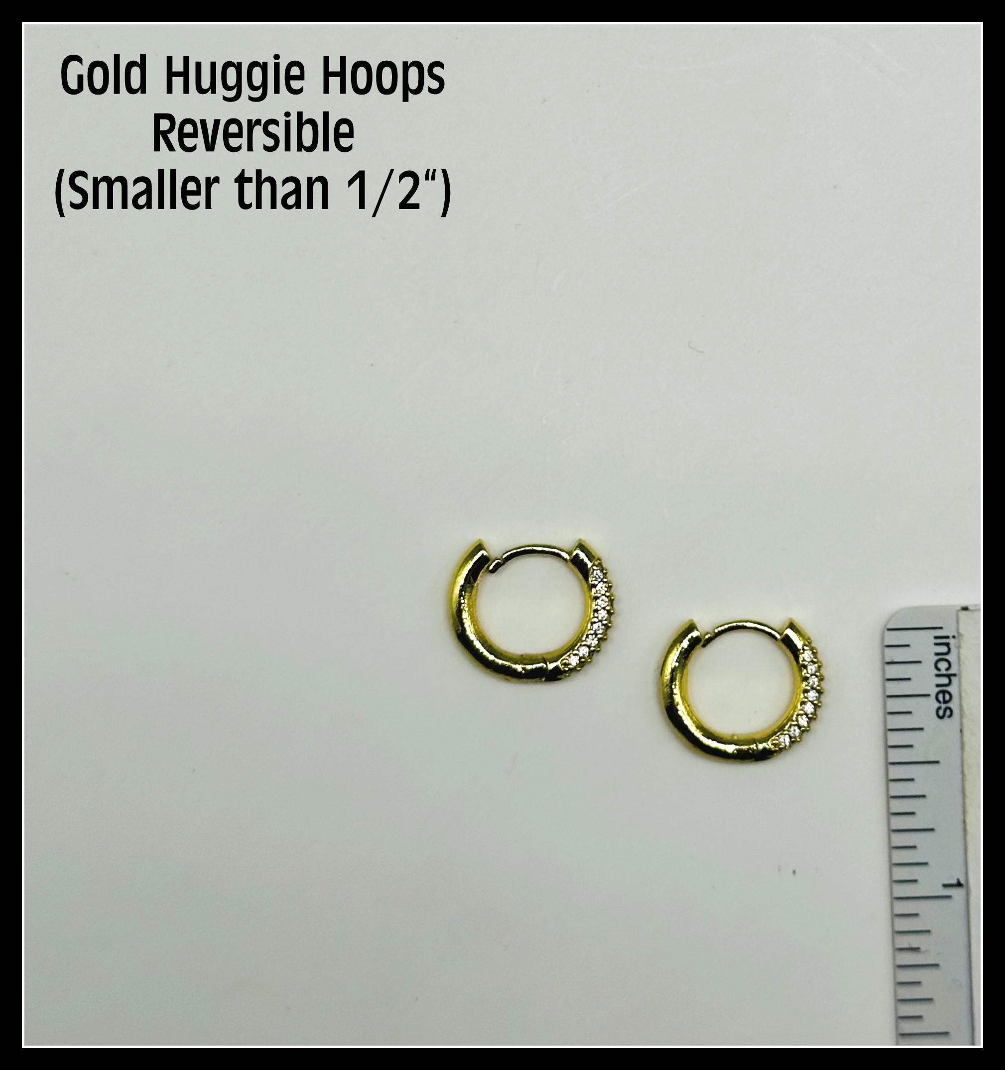 gold huggie hoops, reversible. Place "sparkle" side of hoop towards the front and you have a gorgeous tiny fashion look. Place the sparkle side of hoop towards the back of your earlobe and you have a classic, everyday look. Two different designs in one pair of hoops.