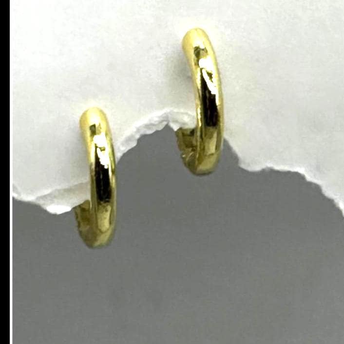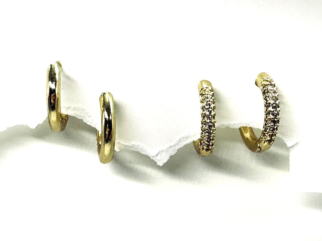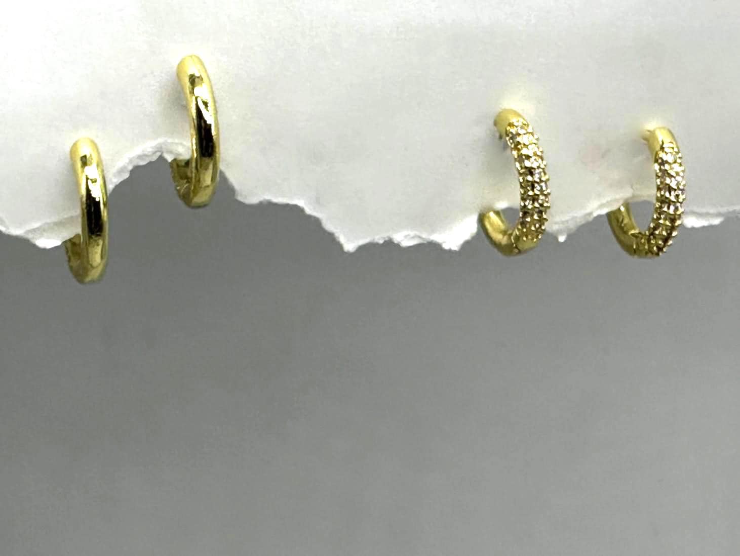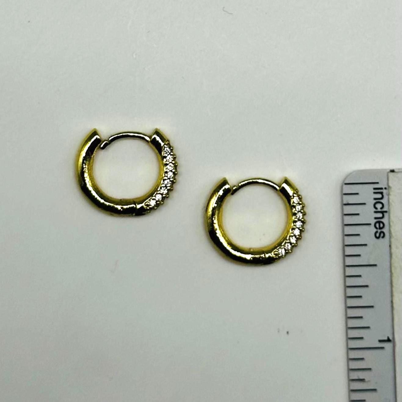 gold huggie hoops, reversible. Place "sparkle" side of hoop towards the front and you have a gorgeous tiny fashion look. Place the sparkle side of hoop towards the back of your earlobe and you have a classic, everyday look. Two different designs in one pair of hoops.
