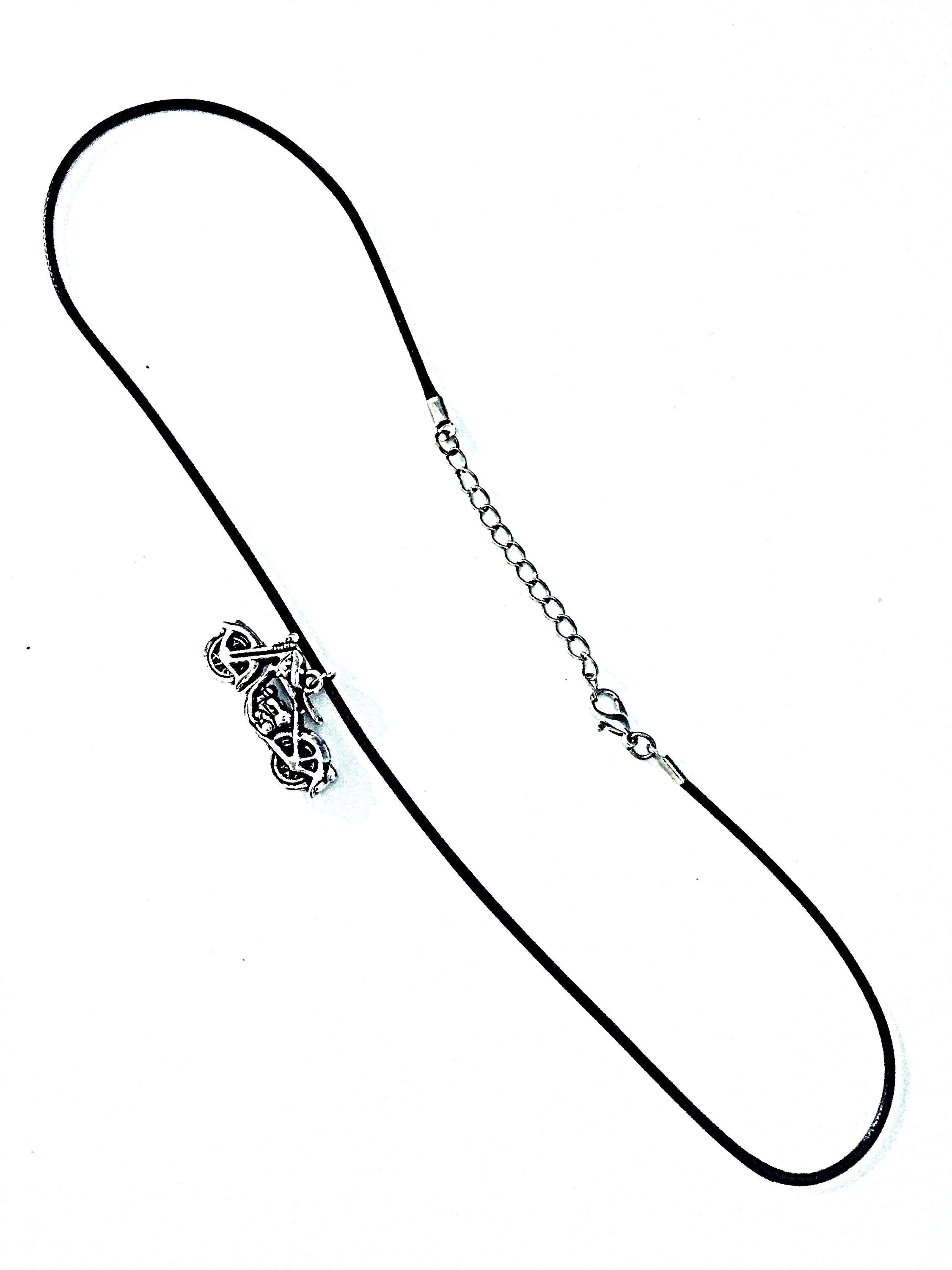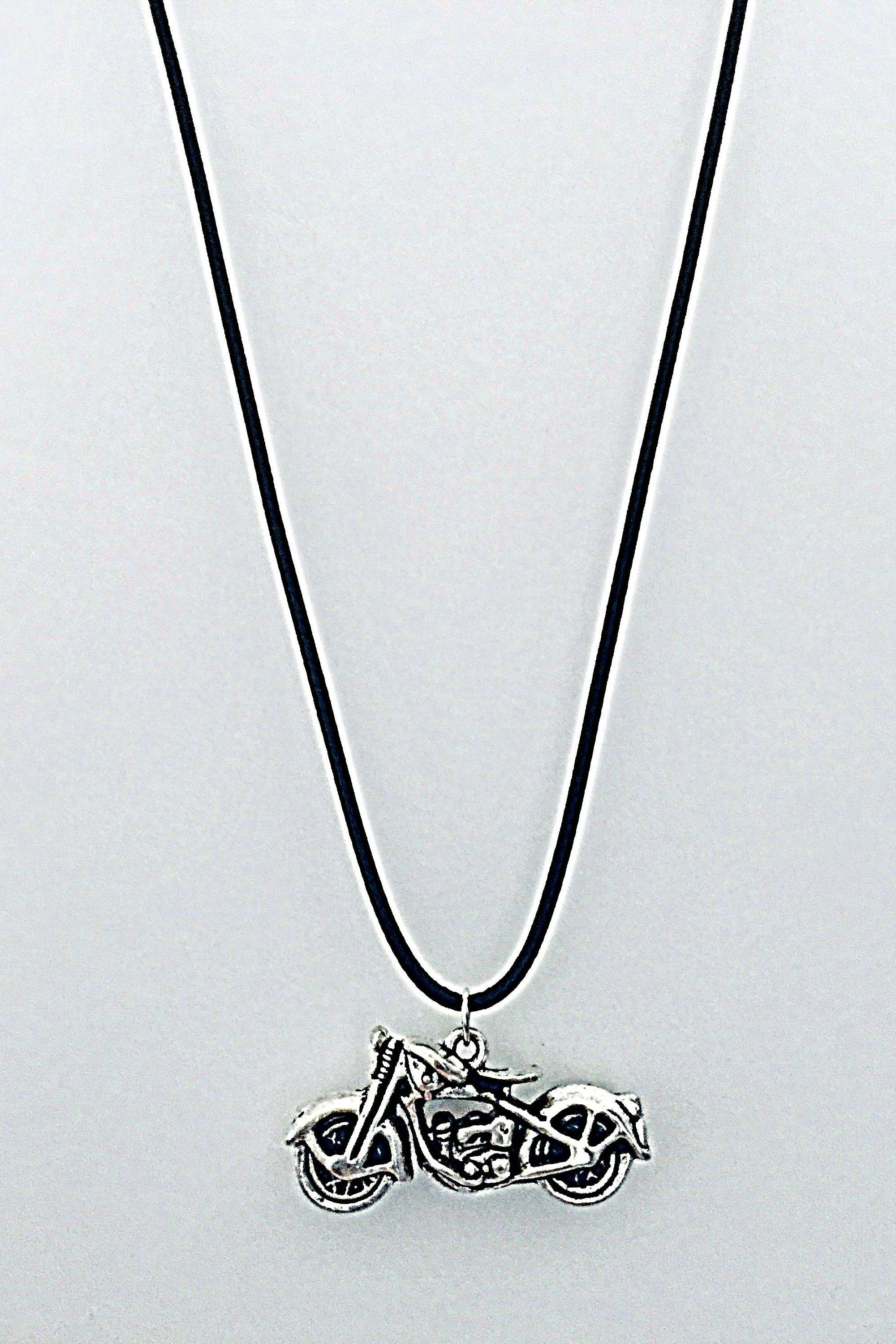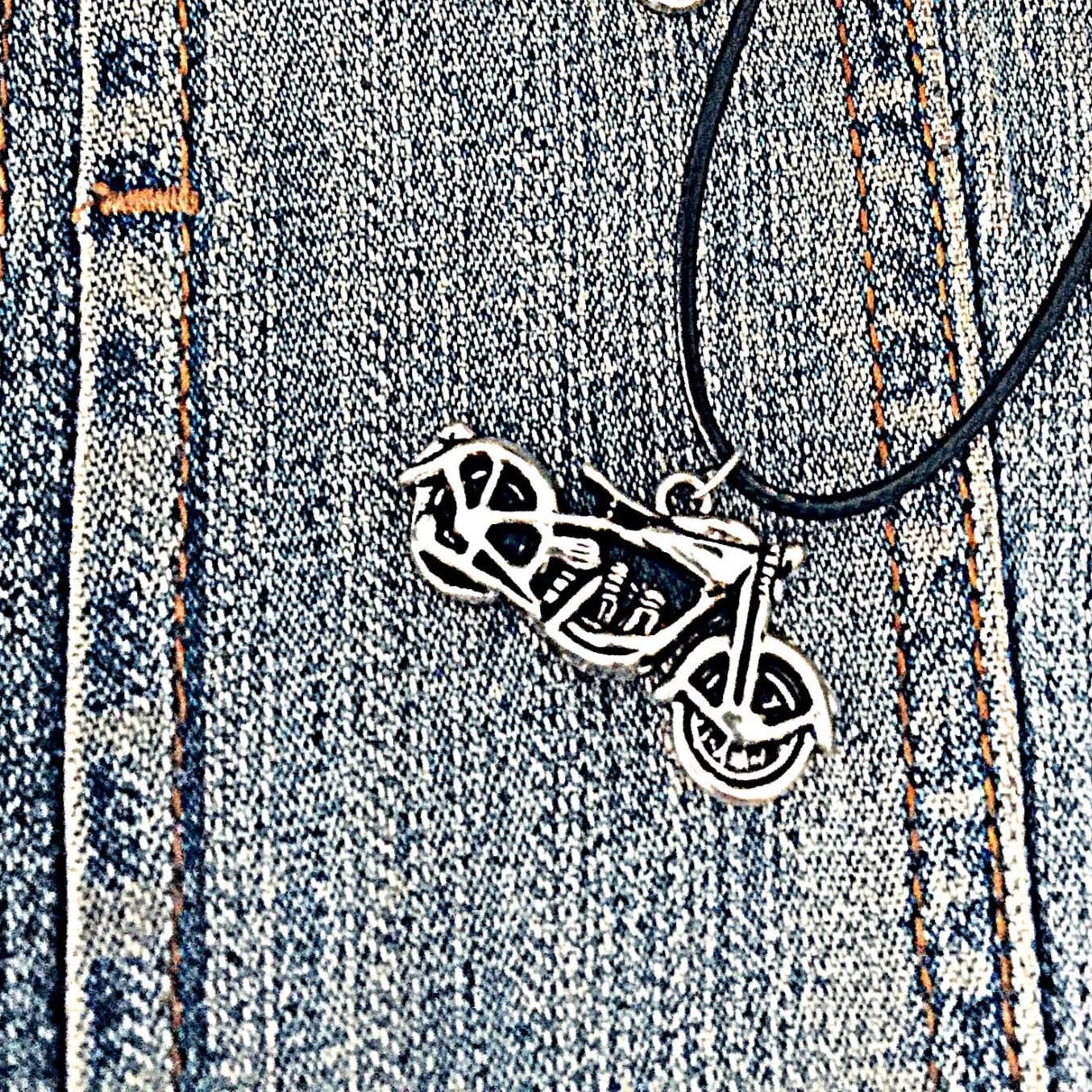 19" leather cord with stylish silver motorcycle Biker pendant. Pendant may be removed and used with longer chain or added to other Hoola pendants to create a cluster look.